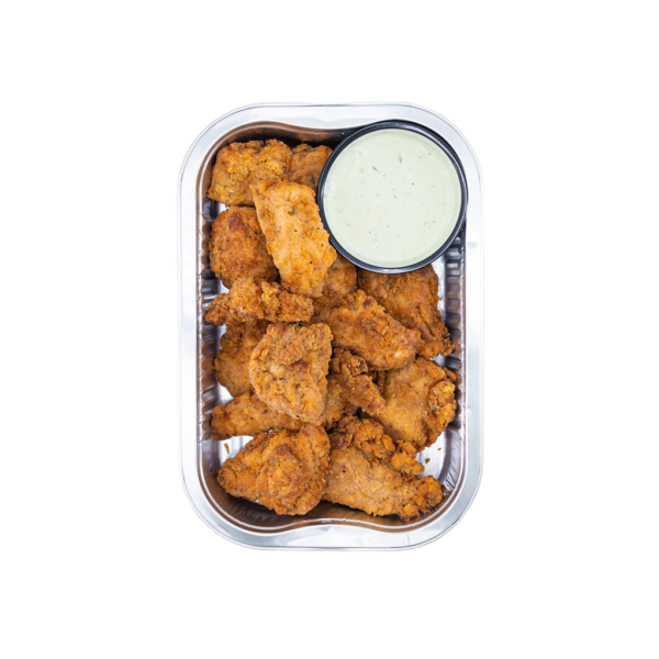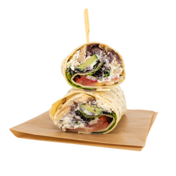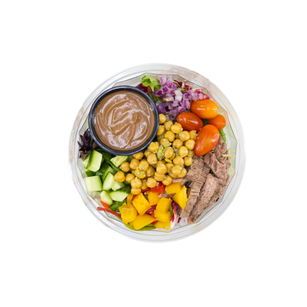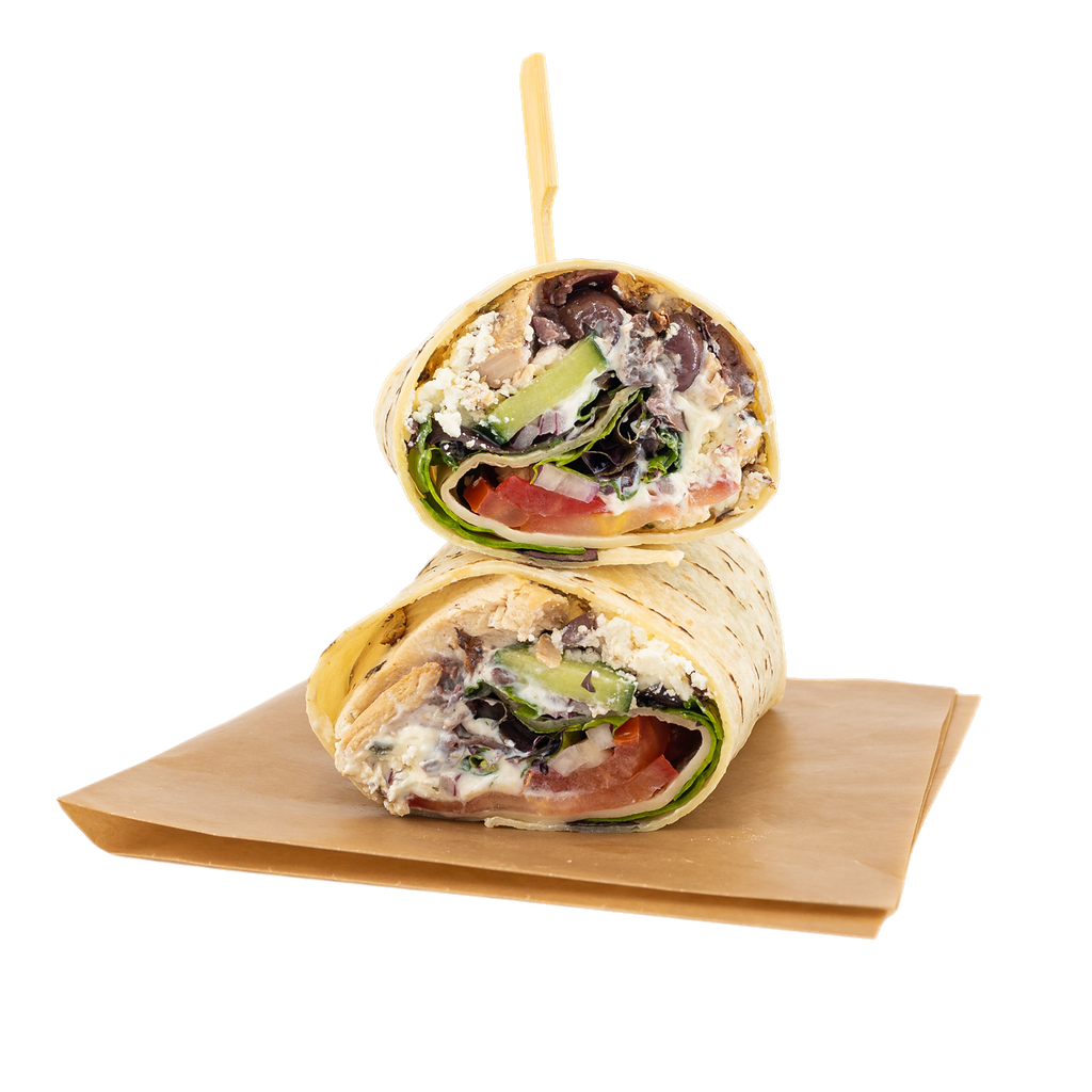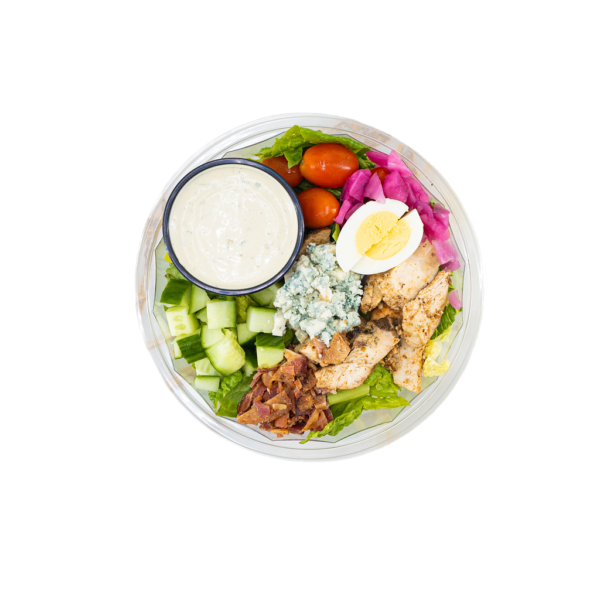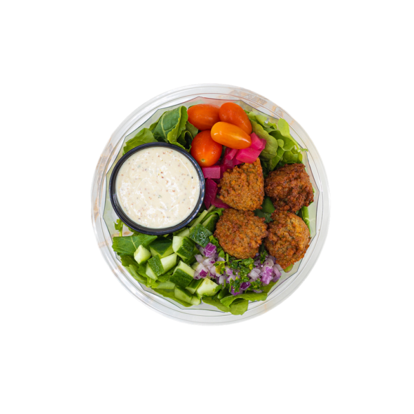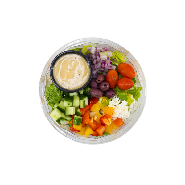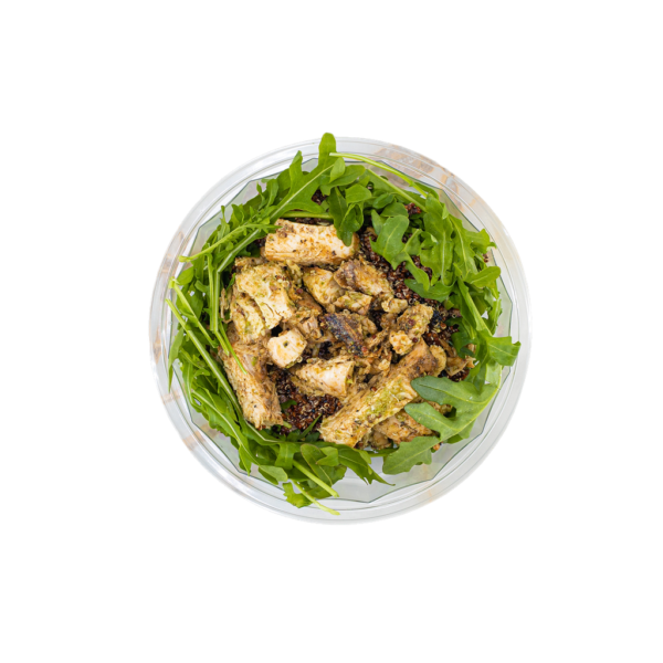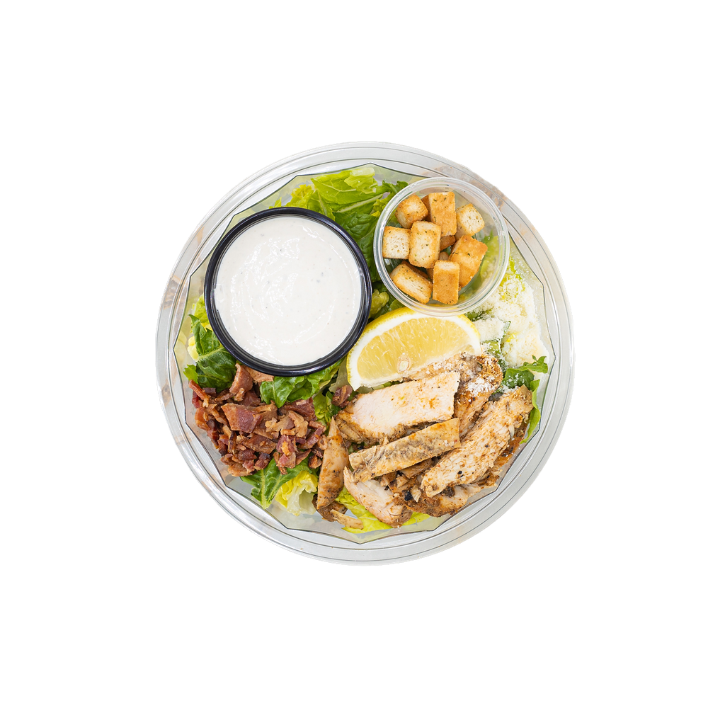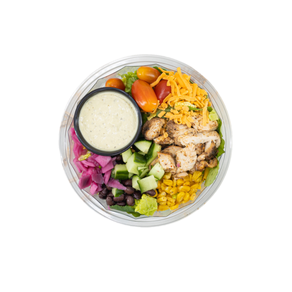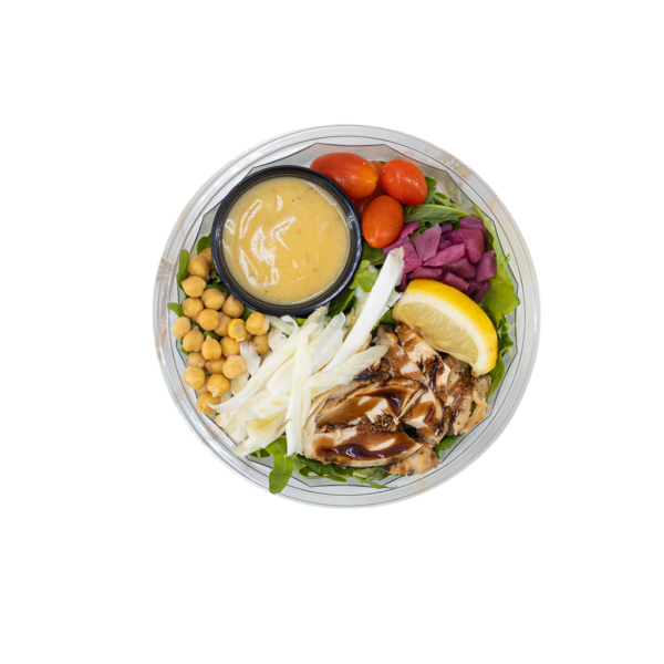 Arugula, Kale, chicken (garlic, oregano, canola), tomatoes, chickpeas, fennel, pickled red onion (vinegar, salt, sugar, garlic, spices), lemon, balsamic glaze, red wine dressing (oregano, olive oil, red wine vinegar, vegetable oil, honey, dijon mustard, salt, black pepper). Contains: sulfites.
