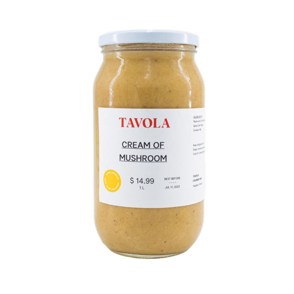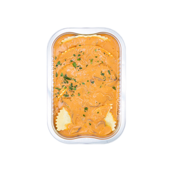 Mushroom agnolotti (pasta semolina, egg, water), mushrooms, onion, garlic, salt, pepper, ricotta, mozzarella, breadcrumbs), tomato sauce (tomatoes, onion, garlic, basil), cream, mushrooms, garlic, thyme, olive oil, parsley, salt and pepper. contains: wheat, milk, and eggs.