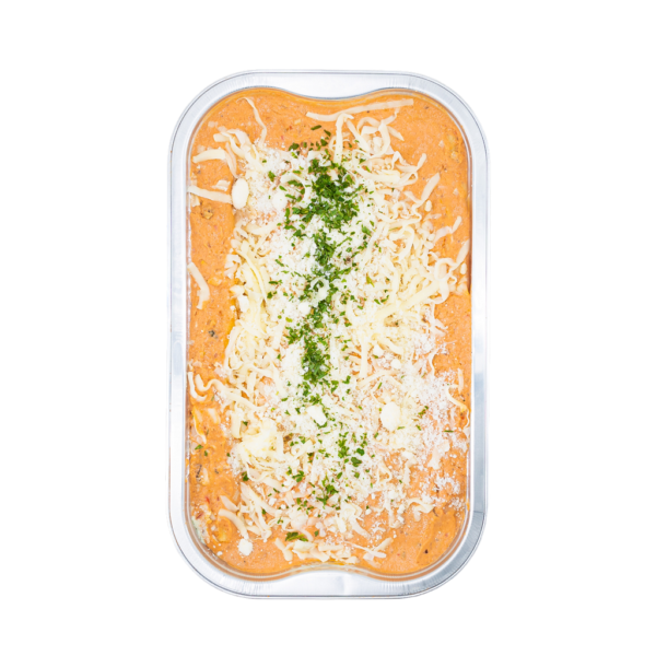 Layers of egg noodle pasta, mozzarella, and Padano cheese with a roasted vegetable Bolognese, ricotta, and arugula pesto.