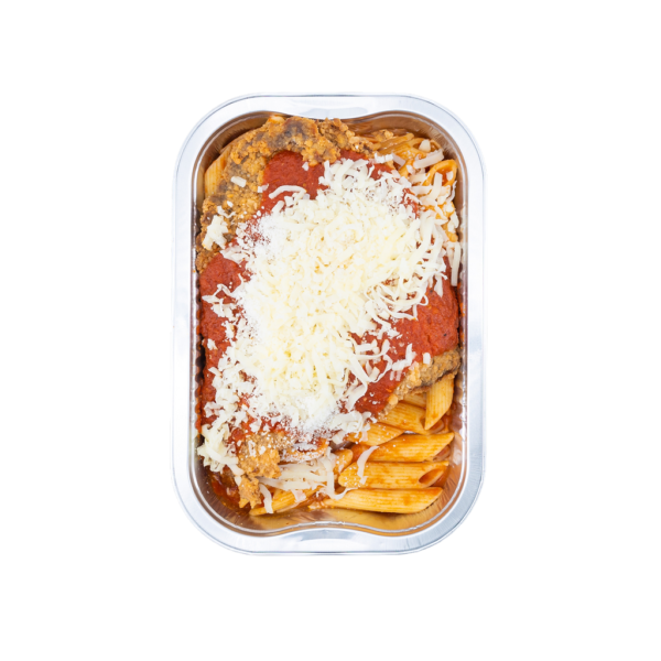 Veal, penne (durum wheat, water), bread crumbs, eggs, flour, tomato sauce (canola oil, tomato, basil, onion, garlic,olive oil), mozzarella, parmigiano cheese, salt, pepper. Contains: wheat, eggs, milk